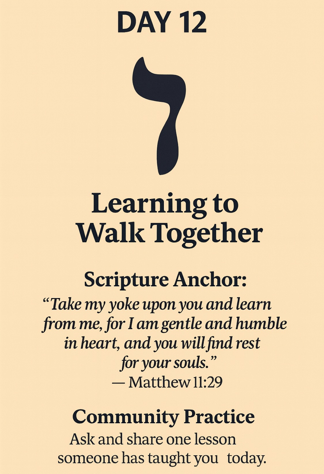 Letter Symbol & Reflection — Hebrew letter, meaning, unity principle. Scripture Anchor — John 17, Ephesians 4, Psalm 133, and others. Community Practice — one concrete unity step. Prayer/Declaration — “In Christ, we begin again today as one body.” Story or Testimony — real examples of unity lived out.
